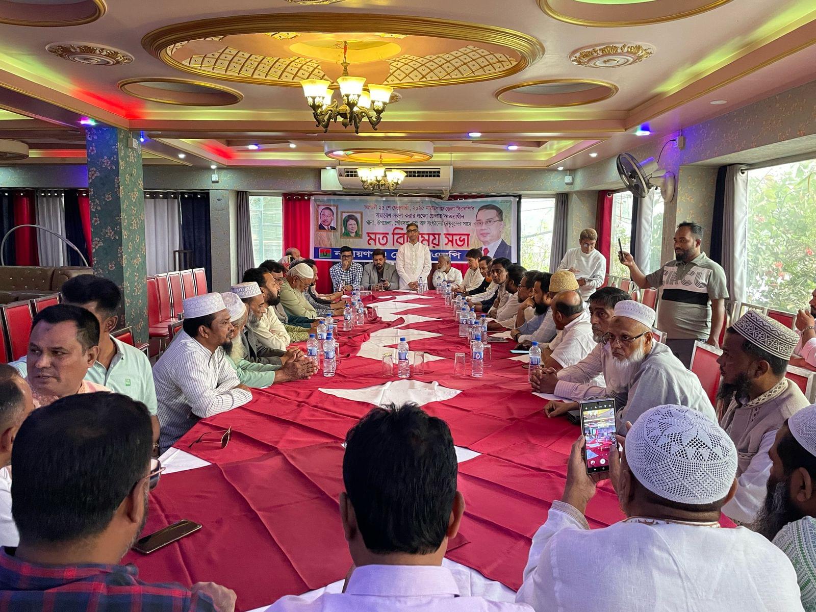 এ মত বিনিময় সভায়, নারায়ণগঞ্জ জেলা বিএনপির আহবায়ক অধ্যাপক মামুন মাহমুদের সভাপতিত্বে সভায় উপস্থিত ছিলেন, জেলা বিএনপির প্রথম যুগ আহায়ক মোস্তাফিজুর রহমান দীপু ভূইয়া, যুগ্ন-আহবায়ক মাসুকুল ইসলাম রাজিবসহ জেলার সকল অঙ্গসংগঠনের সভাপতি ও সাধারণ সম্পাদক উপস্থিত ছিলেন।