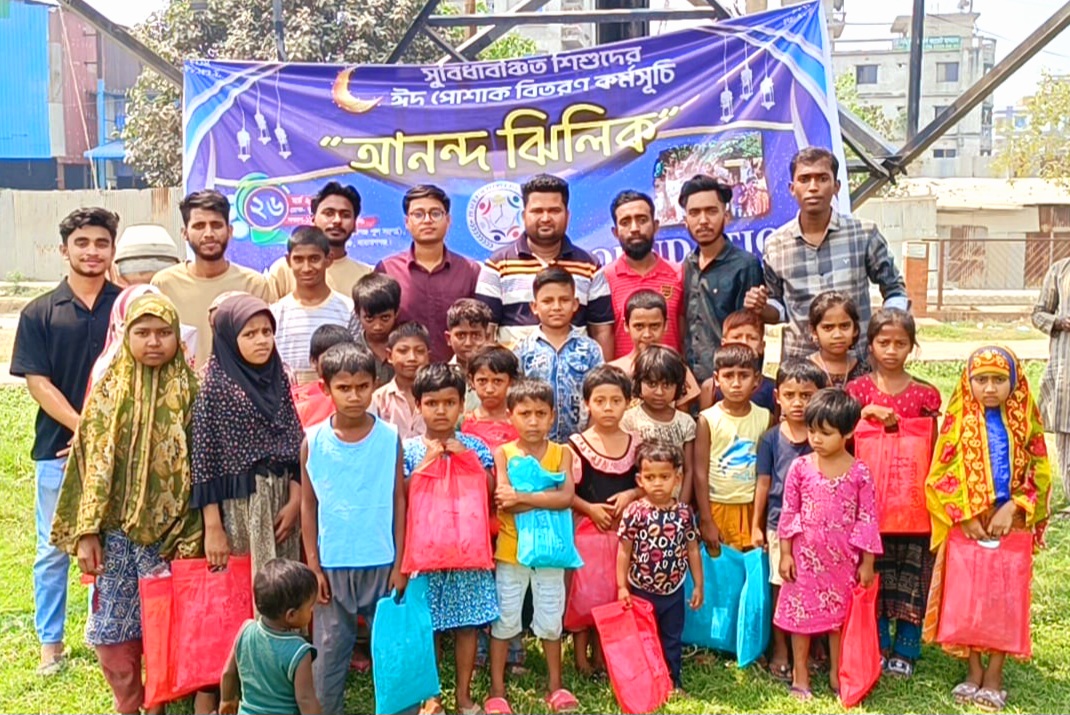 ঈদের নতুন পোশাক পেয়ে খুশিতে মাতল অর্ধশতাধিক সুবিধাবঞ্চিত শিশু। বুধবার (২৬ মার্চ) সকালে সিদ্ধিরগঞ্জ পুলস্থ এলাকায় এই পোশাক বিতরণ করে