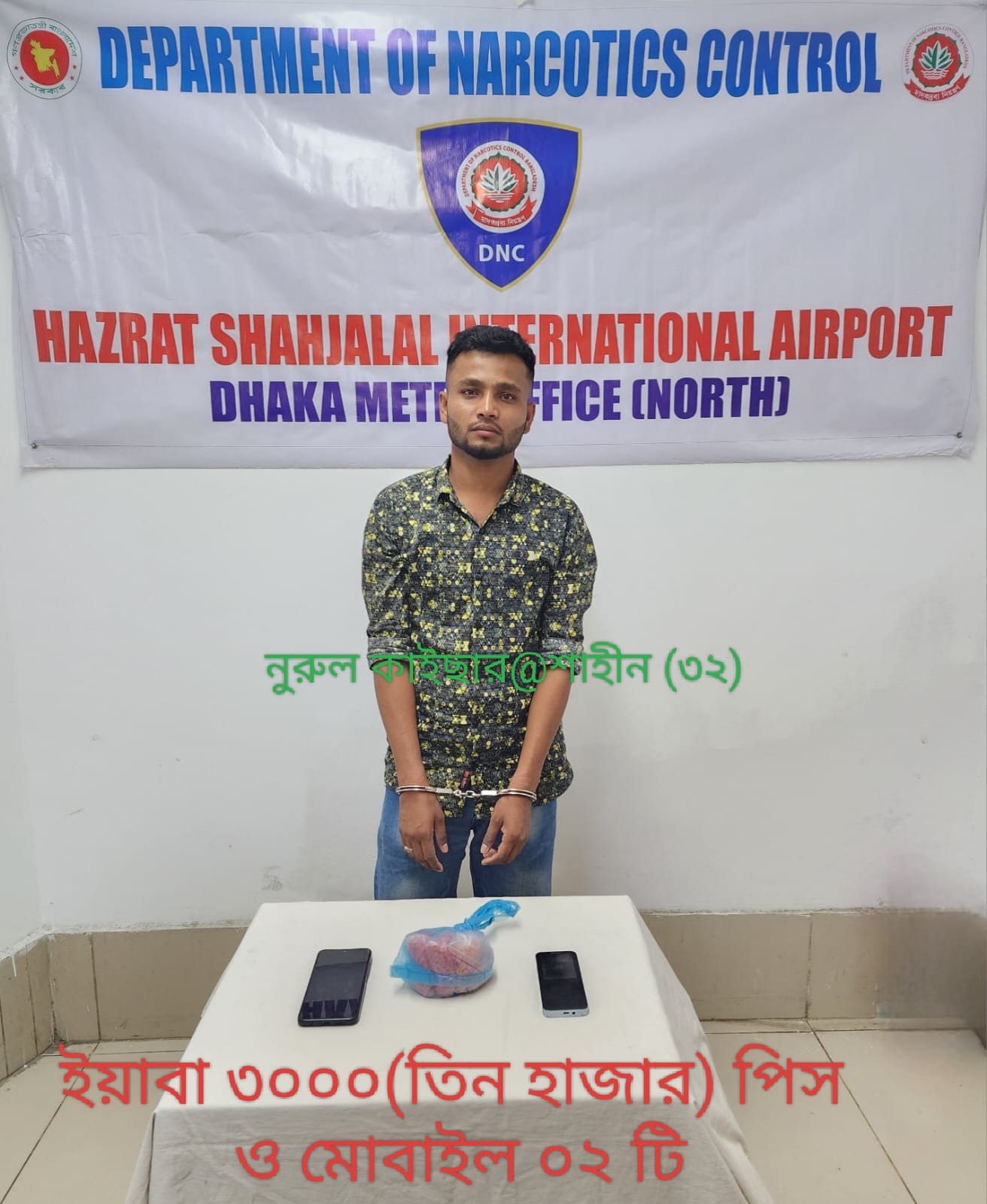 হযরত শাহজালাল আন্তর্জাতিক বিমানবন্দরের অভ্যন্তরে মাদকদ্রব্য নিয়ন্ত্রণ অধিদপ্তরের ঢাকা মেট্রো (উত্তর) কার্যালয়ের একটি মাদকবিরোধী অভিযানে ৩ হাজার পিস ইয়াবা ট্যাবলেটসহ